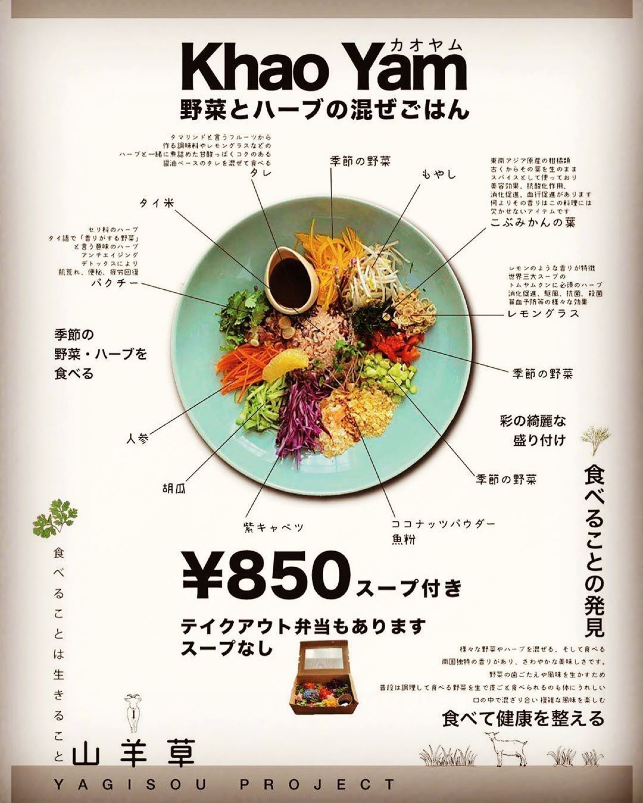 OFLでは、『山羊草プロジェクト』と称して、タイ南部のハーブ混ぜご飯「カオヤム」を通じて、自分の身体に取り入れる食材について、その大切さに興味を持ってもらいたいと考えています。